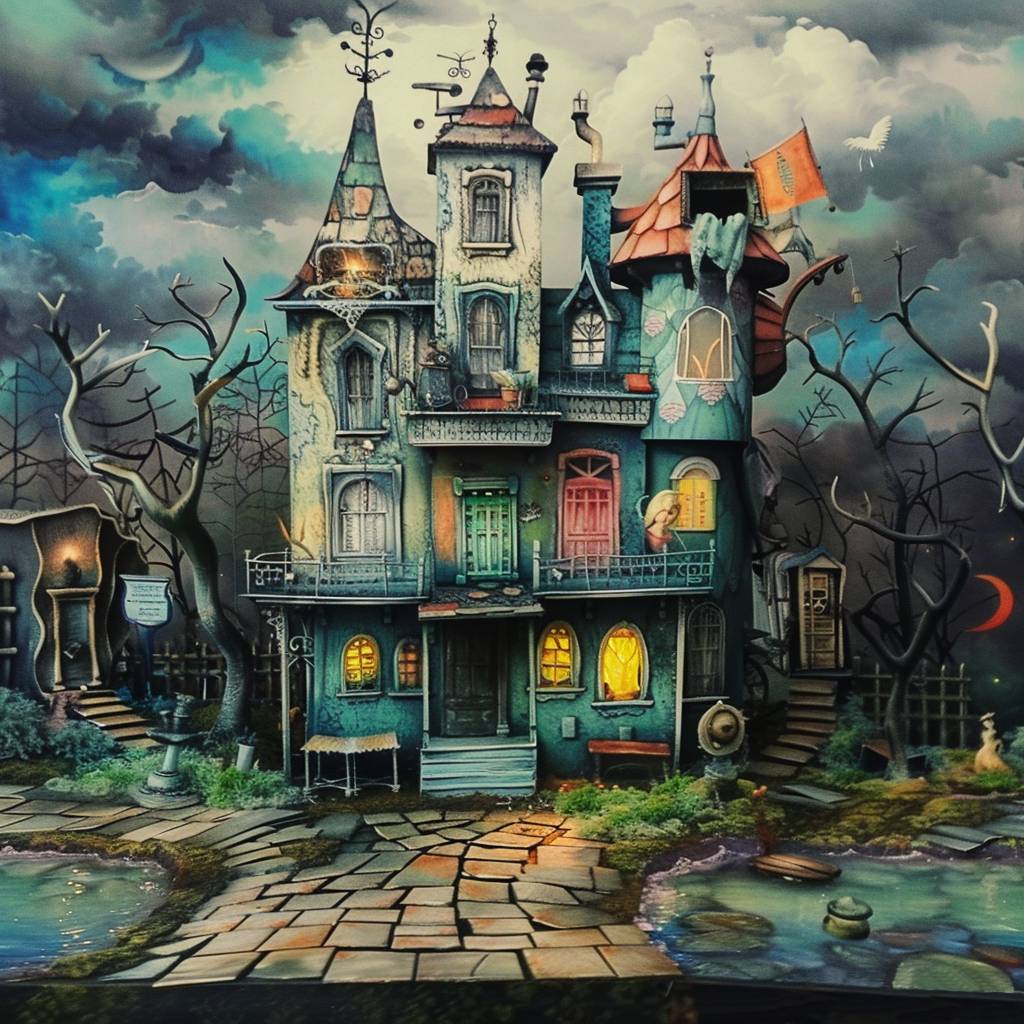 Девочка была удивлена и заинтересована. Стояла пасмурная погода. Возле дома росли деревья, лишенные листвы. Быть может, они уже давно высохли. А может быть просто ждут, когда выглянет солнце и наступит настоящая весна. Сам домик был довольно необычным. Бледно-зеленого цвета, с башенками и люкарнами, круглыми или прямоугольными. С флюгерами и флагами. С окнами самой разной формы. С просторным балконом. Возле дома было два пруда, рос мох и большие, в рост девочки грибы. А еще под окнами первого этажа рос огромный куст цветущей розы. В окнах горел приятный, теплый свет.
