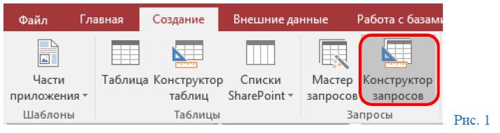 Чтобы создать запрос на выборку, нужно перейти в ленте на вкладку Создание и в группе Запросы нажать кнопку Конструктор запросов (рис. 1).