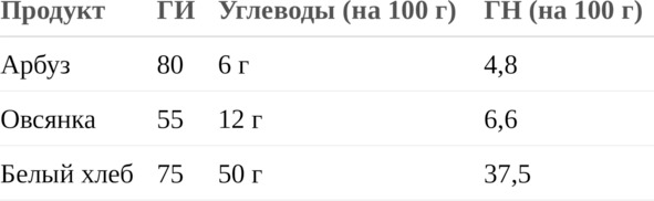 – Пример: 100 г арбуза (ГИ=80, углеводов=6 г) → ГН=4,8
