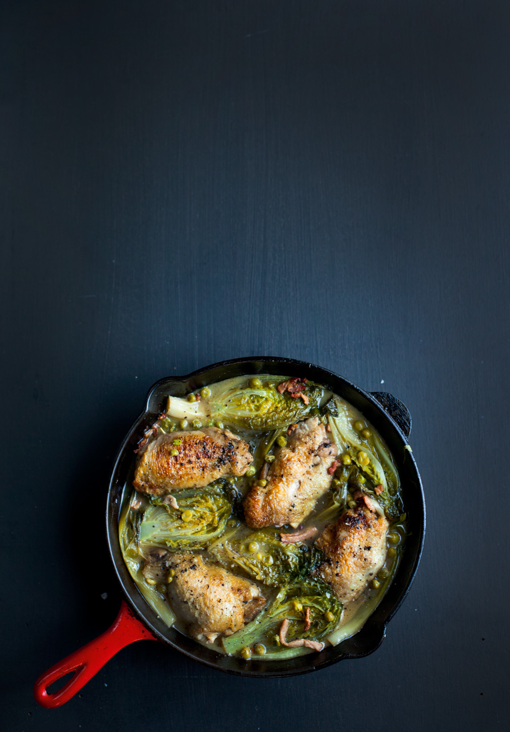 Braised Crispy Chicken Thighs with Spring Onions, Baby Gem & Peas