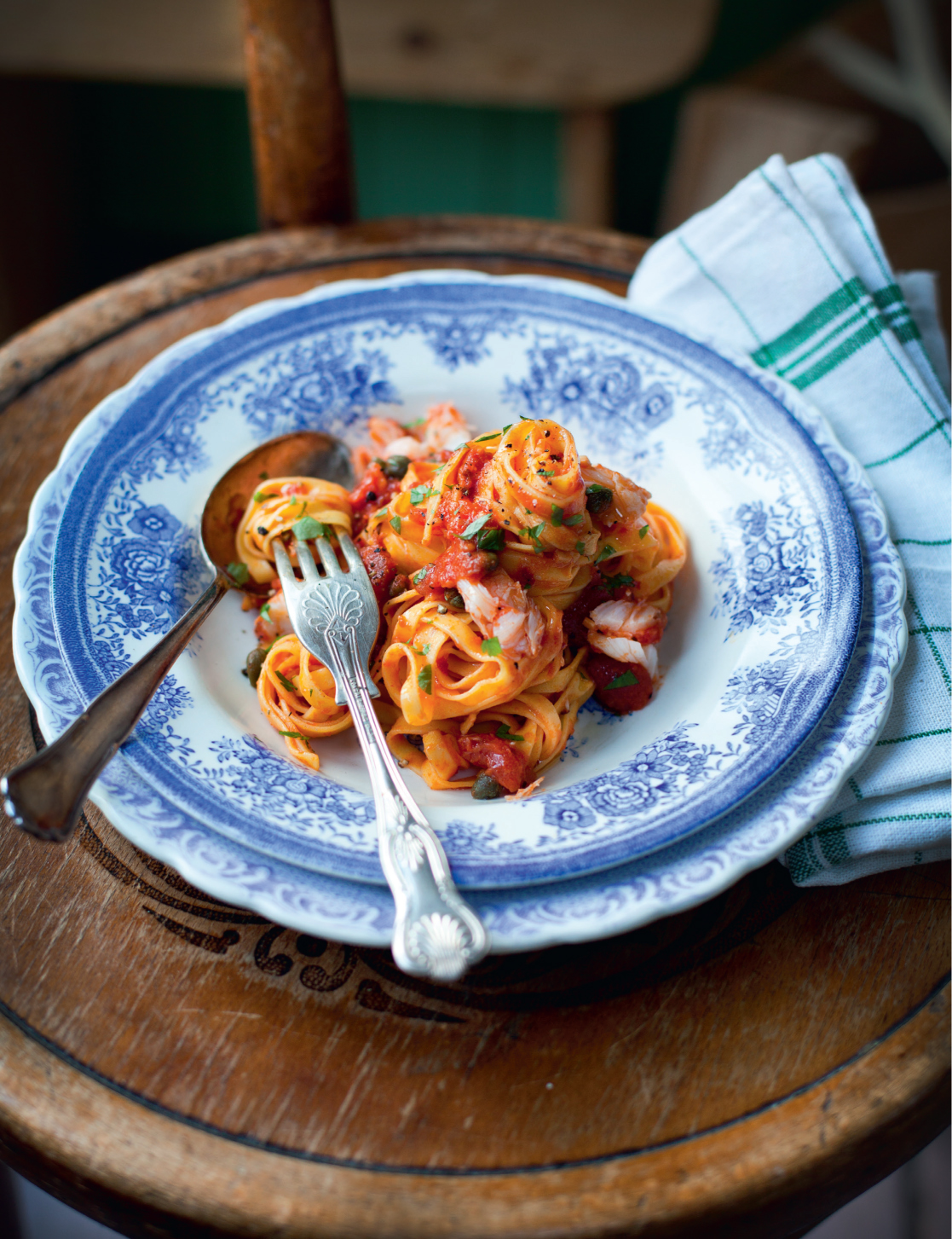 Mix through until the pasta is coated and serve in generous mounds on warmed plates, garnishing with the parsley and a drizzle of extra virgin olive oil.