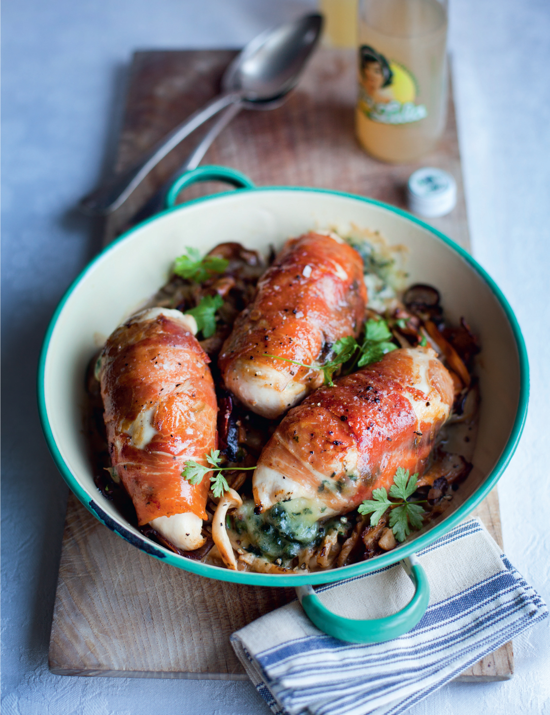 To stuff the chicken, mix together the grated cheese and chopped spinach in a bowl. Lay the chicken breasts on a chopping board and, using a sharp knife, slice horizontally to create a pocket. Stuff each pocket with the cheese and spinach mix. Wrap two slices of prosciutto around each chicken breast.