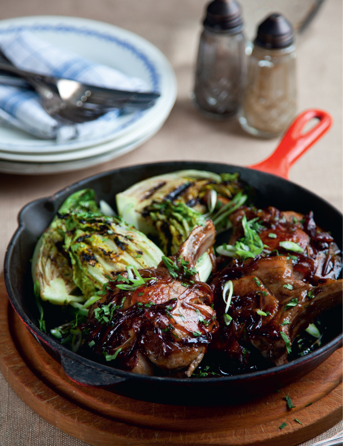 Serve the chops on warmed plates with the charred Baby Gem and scatter with spring onions and a little extra coriander.