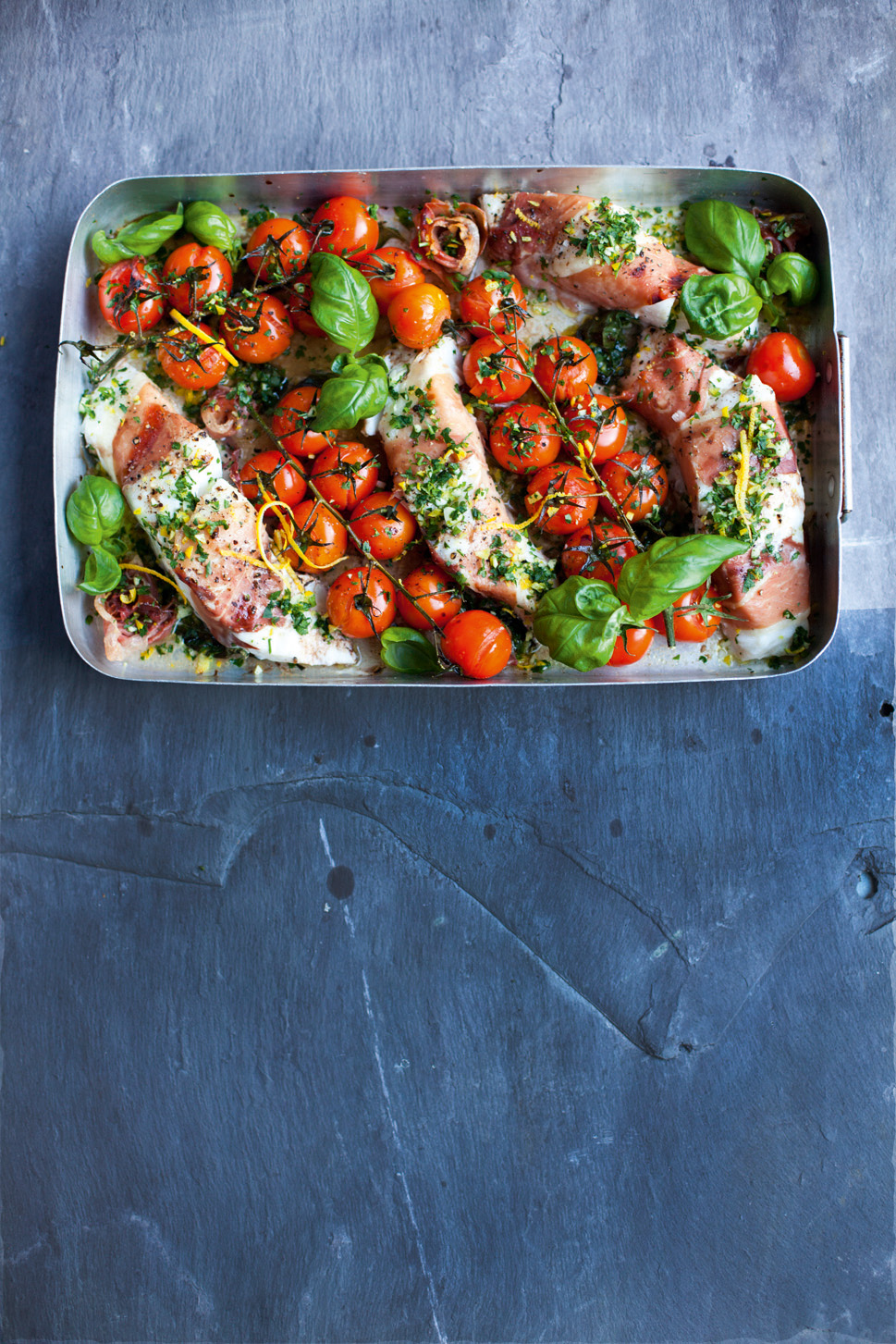 Wrap the fish fillets loosely with slices of prosciutto. Drizzle with a little olive oil and season with sea salt and ground black pepper, then lay the fillets among the tomatoes and pop in the oven for 15 minutes.