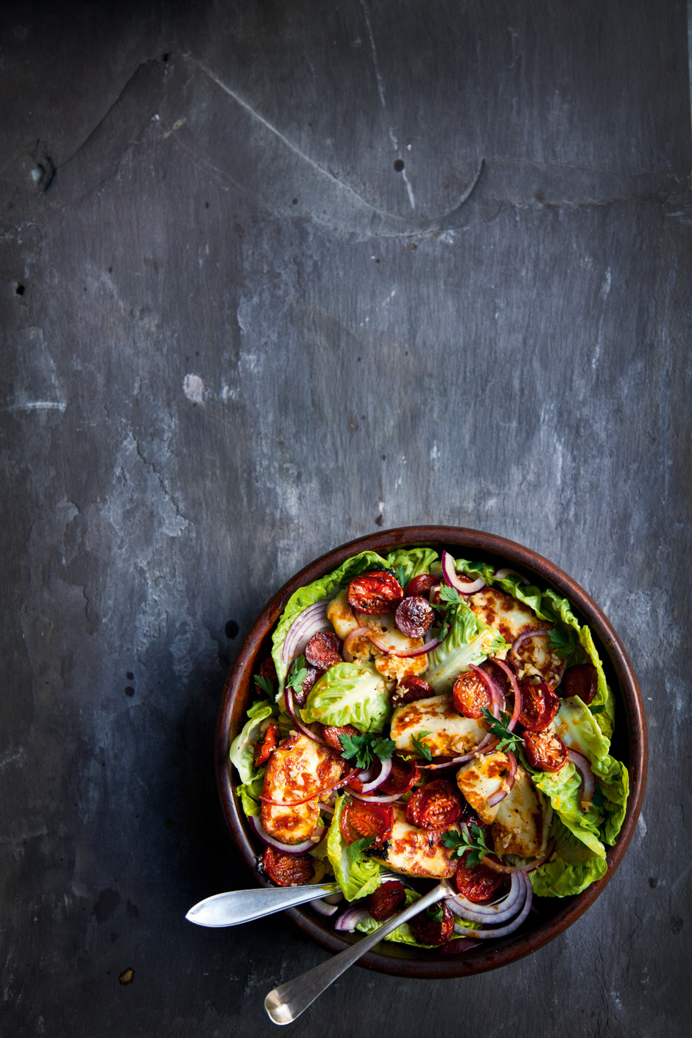 If you ever needed proof that something incredibly delicious can be made in a very short amount of time, then this salad is just that! Packed with punchy heat from the chorizo and salty squidginess from the halloumi, this little dish is full of wonderful things to keep you interested, even if you have very little time to make dinner. Speed up this recipe by buying sunblushed tomatoes intstead of roasting them yourself.