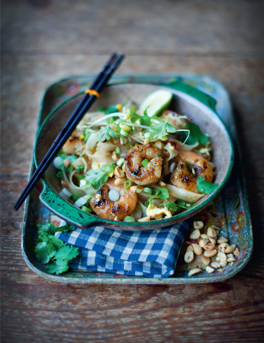 Tumble the noodles out onto warmed serving plates and serve garnished with the coriander leaves, lime wedges, peanuts, and the remaining spring onions and bean sprouts.