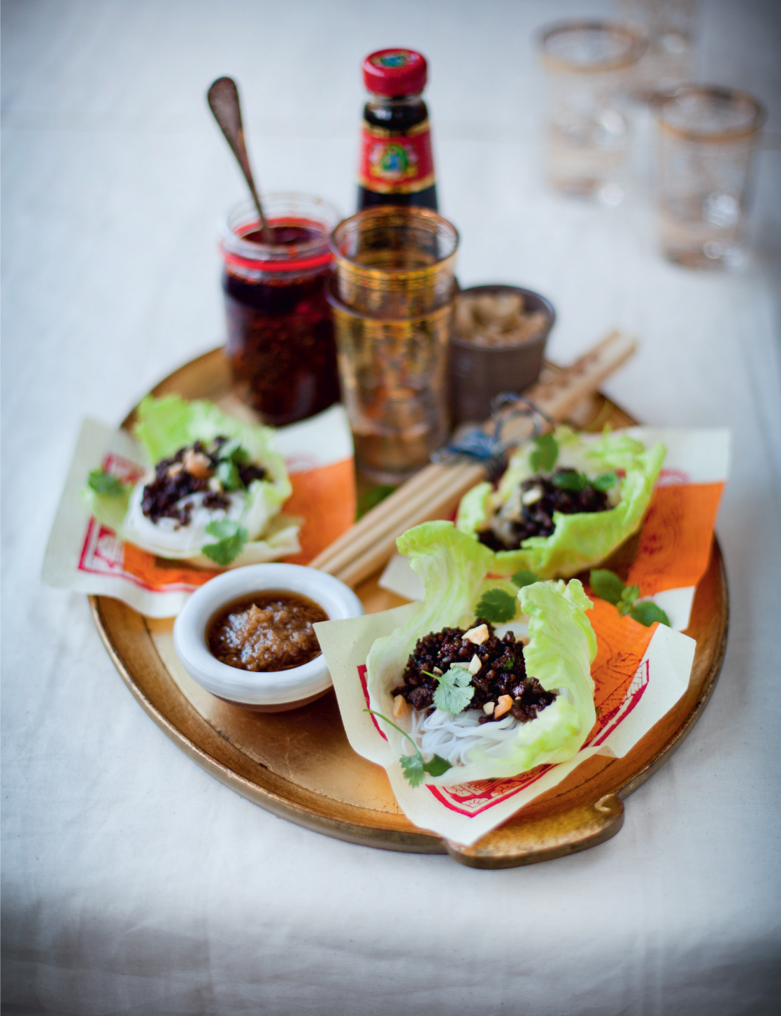 Arrange the lettuce leaves on a serving platter and add a little portion of the noodles to each cup. Divide the cooked turkey on top and then sprinkle with the nuts and remaining coriander and mint. Roll up the lettuce leaves and dunk in the dipping sauce.