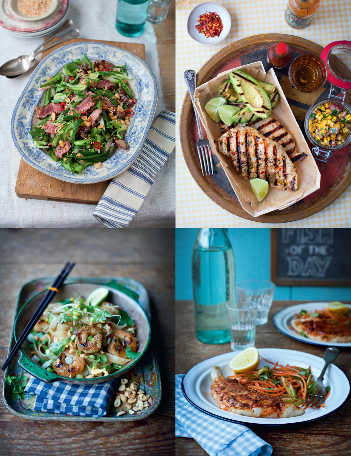 Turkey Noodle Lettuce Cups with Ginger Dipping Sauce Pad Thai Asian Shiitake Mushroom & Chicken Steam-Baked Bags Tomato Basil Tray Roast Fish Fillets with Gremolata Harissa Fish with Carrot & Mint Salad Za’Atar Pork Fillet with Jewelled Herby Pomegranate Couscous Lime & Coconut Chicken Margarita Chicken with Smoky Avocado Corn Salsa Griddled Beef & Mint Salad with Toasted Rice & Peanuts Blackened Salmon with Green Goddess Avocado Salad Butterflied Rosemary Chicken with Romesco Sauce & Simple Steamed Greens