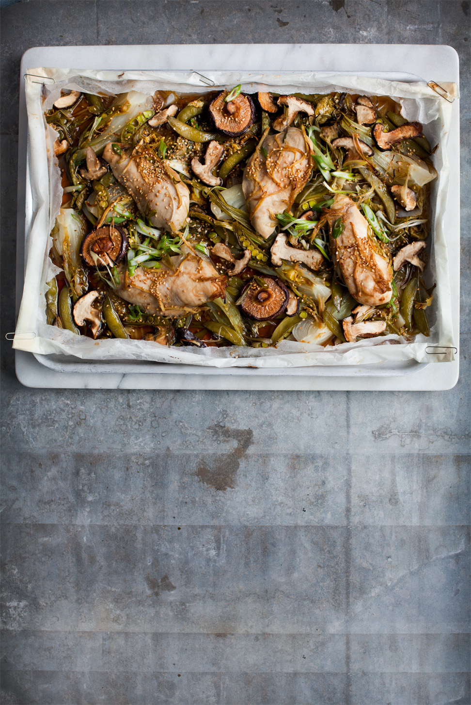 Place another layer of baking parchment over the top. Fold all four sides in and seal with metal paper clips. Cook the whole tray in the oven on the middle shelf for 15–20 minutes until the chicken is cooked through. Serve the tray to the table garnished with a scattering of fresh coriander and some toasted sesame seeds.