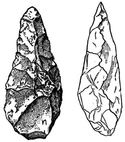 1, Aurignacian (Chatelperron point). 2, 3, Aurignacian (keeled scrapers). 4, Aurignacian point. 5, Magdalenian ("parrot-beak" graving tool). 6, Solutrean (laurel-leaf point). 7, 8, 9, Solutrean (drill, awl, and "shouldered" point). 10, 11, 12, Magdalenian.