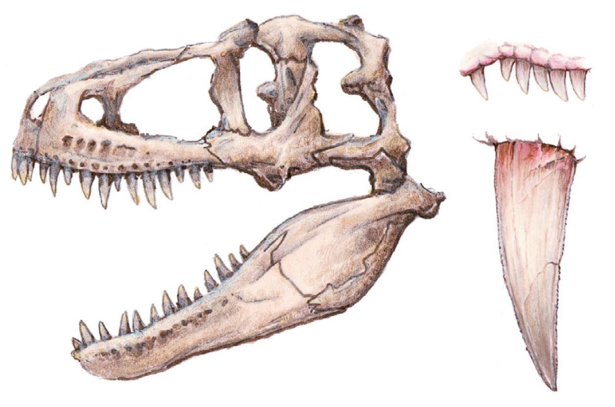 Caption: Meat-eaters: a Tyrannosaurus rex skull and its cutting teeth.