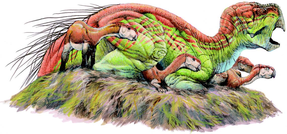 Caption: A nesting Psittacosaurus dinosaur with babies.