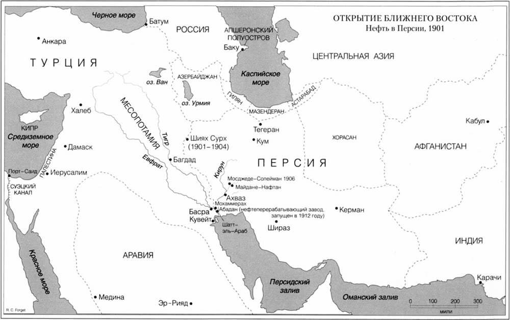 По настоянию Дейна – «жаль отвергать то, что может пойти на пользу стране» – и при поддержке лорда Керзона Рейнолдс направился в Майдане-Нафтан. Он прибыл в это безлюдное место в феврале 1904 г. и в своих отчетах сообщал, что породы насыщены нефтью. Два года спустя, в 1906-м, он возвратился в Мосджеде-Солейман и обнаружил еще больше признаков нефти. Когда Бовертон Редвуд ознакомился с отчетами Рейнолдса, он был в восторге. В них содержалась, объявил он, наиболее важная и перспективная информация на текущий момент.