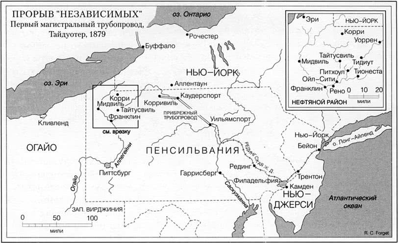 К концу этого периода, именно в тот момент, когда Рокфеллер думал, что все уже практически улажено, нефтяники Пенсильвании сделали последнюю попытку вырваться из удушающих объятий Standard с помощью рискованного эксперимента – первого в мире дальнего трубопровода. У проекта, названного «Прибрежный трубопровод», не было прецедентов, как не было и уверенности в том, что он технически осуществим. Нефти следовало пройти путь в восточном направлении на 110 миль от Нефтяного района до Пенсильванской и Редингской железной дороги. Строительству трубопровода сопутствовали быстрота и секретность. Проводились даже фальшивые изыскательские работы, чтобы Standard Oil не узнала настоящего маршрута. Многие до последнего момента сомневались в том, что трубопровод будет работать. Тем не менее к маю 1879 г. по нему потекла нефть. Это было крупным технологическим достижением, сопоставимым со строительством Бруклинского моста четырьмя годами ранее. Это также явилось новым этапом в истории нефти. Трубопровод стал основным конкурентом железной дороги в транспортировке нефти на дальние расстояния.