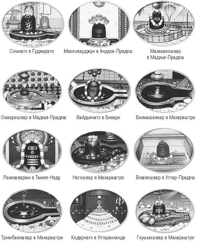 12 основных индийских джйотир-лингамов, или самосветящихся, самосотворенных лингамов, которые упоминаются в гимне, сочиненном в XIII столетии Шанкарачарьей