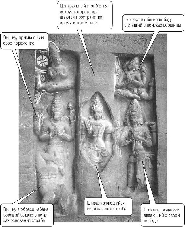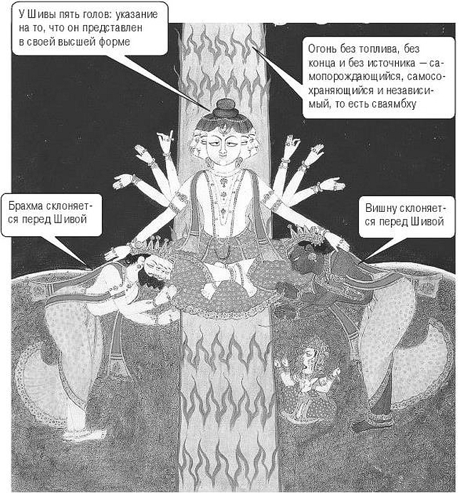 Брахма и Вишну решили отыскать концы огненного столба. Брахма стал лебедем и взлетел на поиски вершины, а Вишну обратился кабаном и начал вкапываться в землю, чтобы отыскать основание. Брахма летел много месяцев и лет, но не увидел никаких признаков того, что этот огненный столб где-то заканчивается. Вишну рыл много месяцев и лет, но тоже не дошел до основы огненного столба. Наконец, обессилев, оба вернулись, чтобы поделиться своими результатами. «У огненного столба нет основания, – признал Вишну. – Он бесконечен». Брахма же солгал: «Я достиг вершины. Я даже нашел на ней цветы кетаки. Я сделал то, чего не смог сделать ты. Я превосхожу тебя величием. Значит, я – Бог».