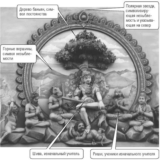 Поэтому Шиву, явившегося из бесконечного огненного столба, который горит без топлива, изображают сидящим под Полярной звездой на покрытой снегом вершине горы в тени дерева баньян. В этой форме отображена идея духовной реальности.