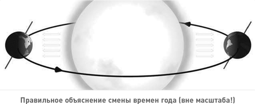Теперь рассмотрим верное объяснение смены времен года. Дело в том, что ось вращения Земли находится под углом к плоскости орбиты, по которой она обращается вокруг Солнца. А это значит, что полгода северное полушарие повернуто к Солнцу, а южное – от Солнца и еще полгода – наоборот. Когда лучи Солнца в одном полушарии падают вертикально[11] (таким образом, на единицу площади поверхности приходится больше тепла), в другом они падают наклонно (и тепла туда попадает меньше).
