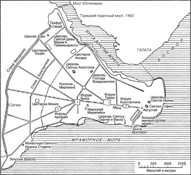 Мысль о переносе столицы из Рима на восток была не нова. Константин примеривался и к Никомедии, и к Фессалонике, но сегодня, оглядываясь на прошлое, мы можем лишь похвалить мудрость его окончательного выбора. Во-первых, город был идеально расположен на пересечении торговых путей. Он не только господствовал над морской дорогой с севера на юг, соединявшей культурный мир Средиземноморья с природными богатствами Руси, но и стоял на перепутье Малой Азии и Восточной Европы, в месте самой узкой морской переправы. Во-вторых, с точки зрения оборонительной, это место обладало значительными преимуществами, так как с юга его ограждало Мраморное море, а с севера бухта Золотой Рог. Доказательством верности стратегического расчета является то, что Константинополь устоял перед всеми нападениями, в то время как почти все другие города не выдержали осад и атак. Его защищали вдоль береговой линии морские стены, а на суше – выстроенная Константином прямая стена, протянувшаяся от Золотого Рога до Мраморного моря. Во времена Феодосия II ее сменила параллельная, более мощная стена, расположенная на милю западнее, чтобы дать простор развитию города.