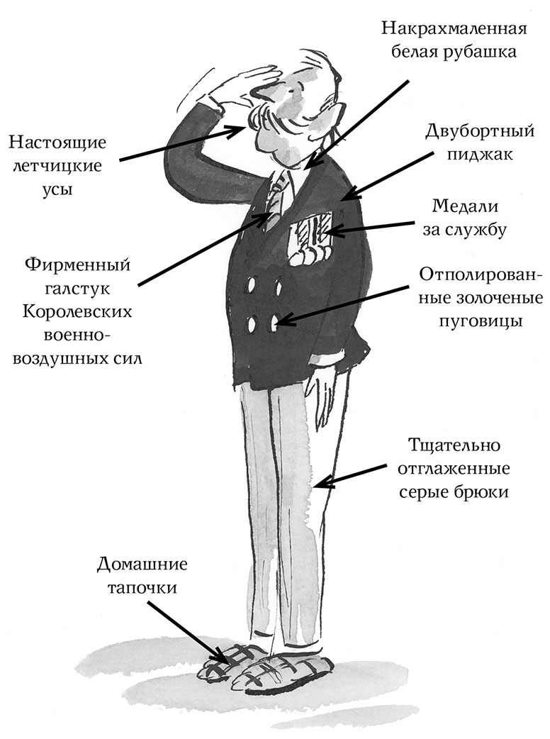 Он был всегда безукоризненно одет по всей форме: двубортный пиджак, накрахмаленная белая рубашка и тщательно отглаженные серые брюки. Шею неизменно обвивал аккуратно повязанный фирменный галстук военно-воздушного флота – темно-бордовый с темно-синими и серебряными полосками. И усы дедушка носил по моде летчиков времен Второй мировой – длинные и вразлет. Совершенно удивительные усы! Такие длинные, что сливались с бакенбардами. Получалась почти борода, только подбородок голый. Дедушка часами начесывал кончики усов, чтобы они торчали ровно под правильным углом.