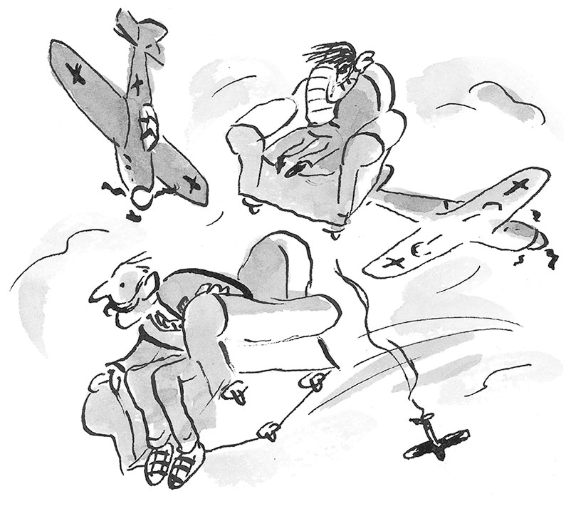 – Дело было летом сорокового года, – начинал дедушка. – В самый разгар Битвы за Британию. Лечу я однажды вечером на моем «Спитфайре» над Ла-Маншем. Ну и отбился ненароком от своей эскадрильи. Меня изрядно потрепали в воздушном бою. Хромаю, значит, потихоньку на базу. И тут сзади пулемет. ТРА-ТА-ТА! Наци! «Мессершмитт» – и прямо у меня на хвосте. И снова: ТРА-ТА-ТА! А нас только двое над морем. Эпическая предстояла схватка, не на жизнь, а на смерть…