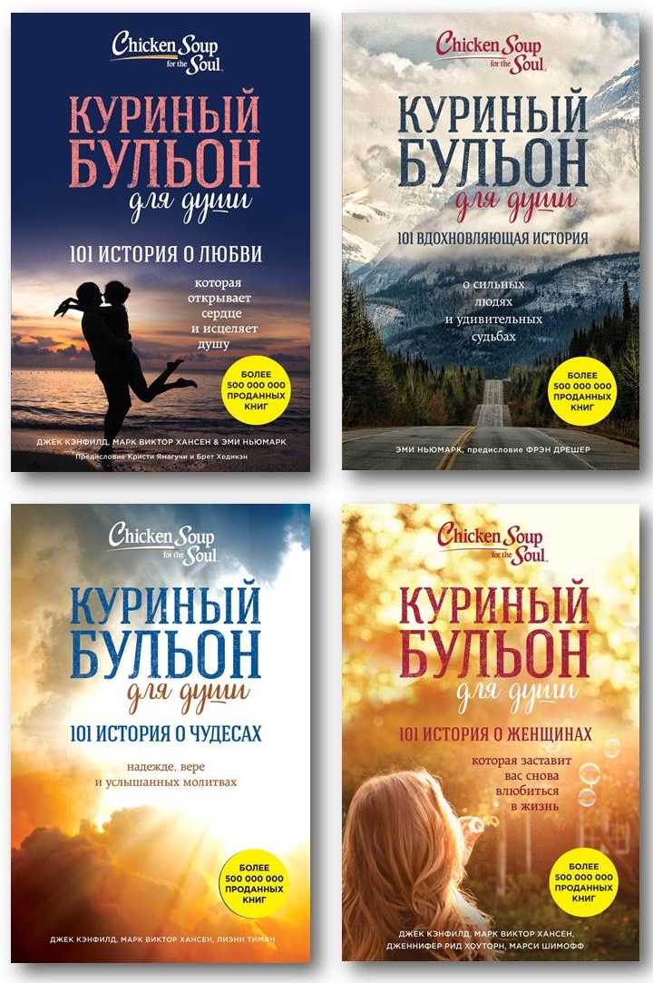 Также у нас поэт и прославленный автор четырех книг МК Асанте, названный CNN «мастером рассказа»; Ник Ортнер, писатель и генеральный директор The Tapping Solution, чья деятельность посвящена жизни без стресса; Роберт Холден, чьи исследования в Великобритании по проблемам позитивности, духовности и счастья легли в основу нескольких книг и двух документальных фильмов BBC; а также Тори Джонсон, которая помогла миллионам людей своими книгами и регулярными выступлениями в передаче ABCДоброе утро, Америка. И наконец, новое издание было бы неполным без рассказов от создателей серии Джека Кэнфилда и Марка Виктора Хансена, а также от издателя и креативного лидера Эйми Ньюмарк.