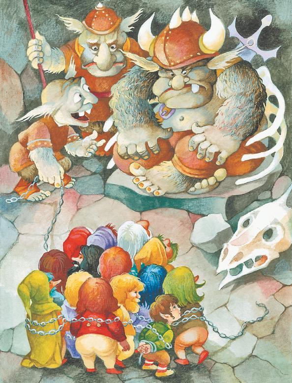 Топ! Шлёп! Чёрный гроб!Хрип! Храп! Бей! Грабь!Тащи свои кости к гоблинам в гостиЖивее, малыш!Крик! Крак! Стук! Бряк!Тьма и мрак! Кулак и тесак!Бей и круши в подземной глуши!Страшись, малыш!Свист плетей! Хруст костей!Этот звук тешит слух! Ух!Гоблинам нужен обед и ужин.Поедят-попьют и сидят поютВ пещере, малыш!От этой песни и впрямь становилось страшно. Каменные стены, казалось, повторяют эти «крик-крак» и «стук-бряк». Эхом отдавался безобразный гогот, множилось устрашающее «хрип-храп», «бей-грабь». И слишком ясен был смысл этой грозной песни. А гоблины выхватили хлысты и, стегая пленников, под крики: «Свист плетей! Хруст костей!» погнали их вперед. Гномы стенали, стонали, вскрикивали и всхлипывали. И вдруг все они кубарем скатились в огромную пещеру.