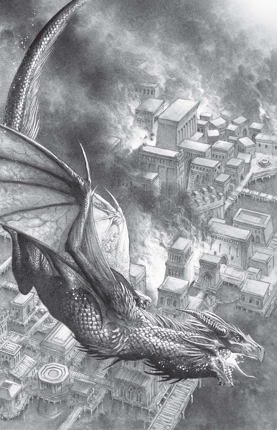 Once again the king unleashed his dragons against Dorne. Aegon himself fell upon Skyreach, vowing to make the Fowler seat “a second Harrenhal.” Visenya and Vhagar brought fire and blood to Starfall. And Rhaenys and Meraxes returned once more to the Hellholt … where tragedy struck. The Targaryen dragons, bred and trained to battle, had flown through storms of spears and arrows on many occasions, and suffered little harm. The scales of a full-grown dragon were harder than steel, and even those arrows that struck home seldom penetrated enough to do more than enrage the great beasts. But as Meraxes banked above the Hellholt, a defender atop the castle’s highest tower triggered a scorpion, and a yard-long iron bolt caught the queen’s dragon in the right eye. Meraxes did not die at once, but came crashing to earth in mortal agony, destroying the tower and a large section of the Hellholt’s curtain wall in her death throes.