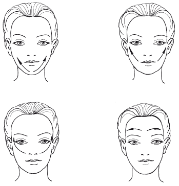 Кожными линиями называют линии наименьшего растяжения кожи. Все косметические процедуры: очищение кожи лица и шеи, нанесение крема, масок, пудры, самомассаж, снятие масок и крема – проводят строго по линиям наименьшего растяжения кожи снизу вверх.