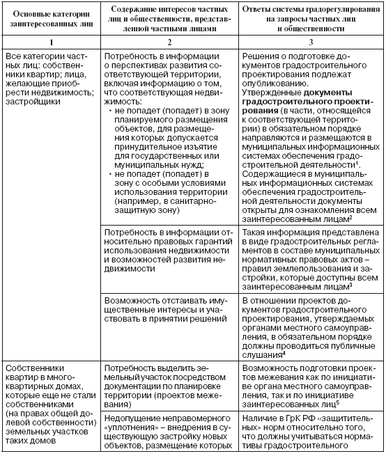 Градорегулирование как механизм обеспечения баланса интересов, гарантирования прав и возможности проявления инициативы частными лицамиОбщественные и частные интересы согласуются между собой, но они не могут и не должны отождествляться. Нельзя полностью согласиться с теми, кто утверждает: хорошо частному лицу – хорошо обществу, поскольку неограниченная деятельность частных лиц может причинить обществу вред. Но точно так же неправы и те, кто говорит: хорошо обществу – хорошо частному лицу. Частным лицам будет плохо, если их свободная деятельность неоправданно ограничивается. От этого будет плохо и обществу. Значит, мы имеем дело с нетождественными интересами, и между ними необходимо установить баланс. Возможность установления такого баланса возникает при наличии в системе градорегулирования ответов (в форме соответствующих решений, документов, технологий) на запросы частных лиц и общественности (табл. 1.1).