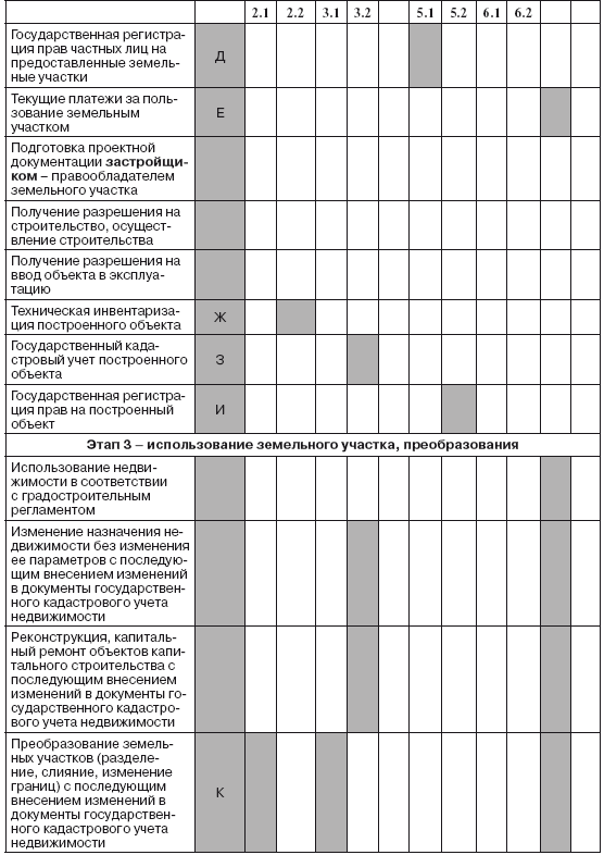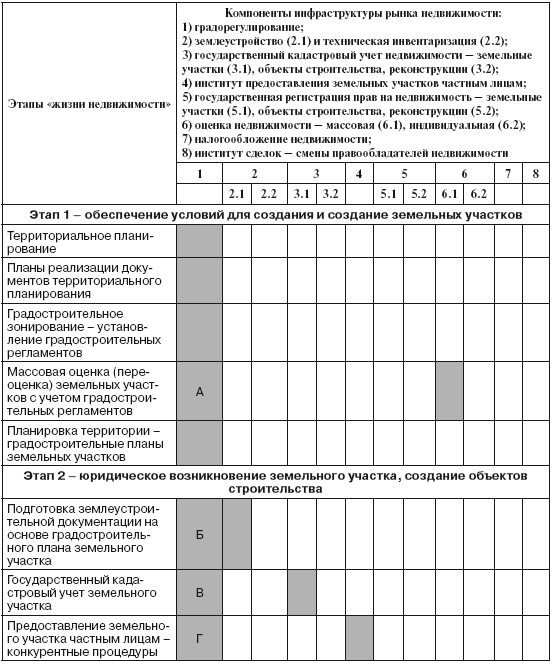 Как соотносится и взаимодействует градорегулирование с иными компонентами инфраструктуры рынка недвижимости на различных этапах «жизни недвижимости» – от подготовки условий для создания объектов недвижимости до их последующей эксплуатации, видно из табл. 1.2. В таблице 1.2 зафиксирована реальная последовательность действий, выполняемых до создания объектов, в процессе их создания и после создания, т.е. в процессе использования. Анализ таблицы позволяет сформулировать два вывода принципиальной значимости:
