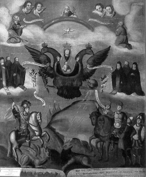 АЗО́ВСКАЯ ИКО́НА БО́ЖИЕЙ МА́ТЕРИ. Почитание начинается при царице Софии Алексеевне (1657–1704), со времени первого похода к Азову в 1686 г. под предводительством князя В.В. Голицына. Особенность иконографии – изображение Богоматери с Младенцем на фоне двуглавого орла, держащего в лапах скипетр и державу – символы государственности. Наверху, в окружении ангельских сил, Бог Саваоф и Святой Дух в виде голубя. В молитвенном предстоянии изображены свв. Антоний, Феодосий и Алипий Печерские, Моисей Угрин, Прохор, Марк; ниже – в образе Георгия Победоносца конный воин, побивающий копьем змия, а также изображение пеших и конных воинов; на нижнем поле помещены вирши.
