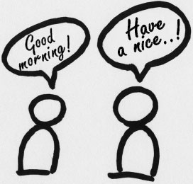 Good morning/afternoon/evening – вежливое приветственное обращение как в официальной, так и в обыденной ситуации. Выбор morning/afternoon/evening зависит от времени встречи.