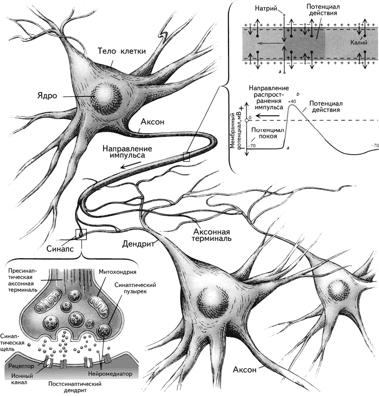 Помимо структурных и молекулярных особенностей, еще более тонкие различия выявляются между нейронами при изучении входов последних (всех поступающих сигналов и аппарата их приема) и проекций (всех посылаемых сигналов и аппарата их передачи), которые зависят от функциональной активности клеток. Места соединений нейронов друг с другом называются синапсами.