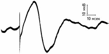 Вызванный потенциал (ВП) состоит из последовательности отрицательных и положительных отклонений от основной линии и длится около 500 мсек после окончания действия стимула. У ВП можно оценить амплитуду и латентный период возникновения (рис. 2.12).