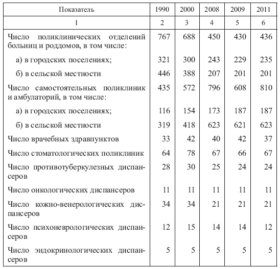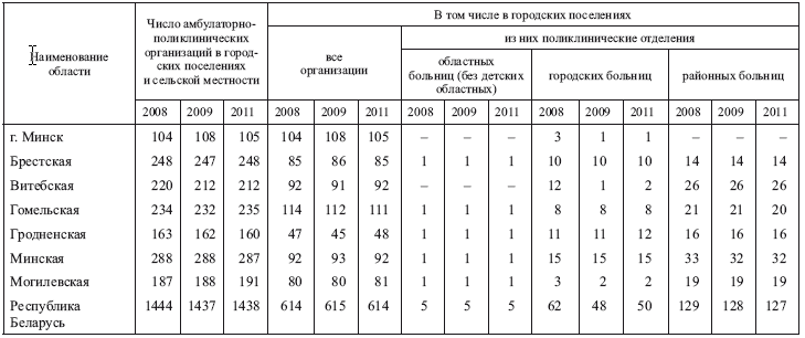 В 2011 г. из числа амбулаторно-поликлинических ОЗ медицинская помощь населению оказывалась в 810 самостоятельных поликлиниках и амбулаториях, большинство из которых функционировали в сельской местности (табл. 1.2).