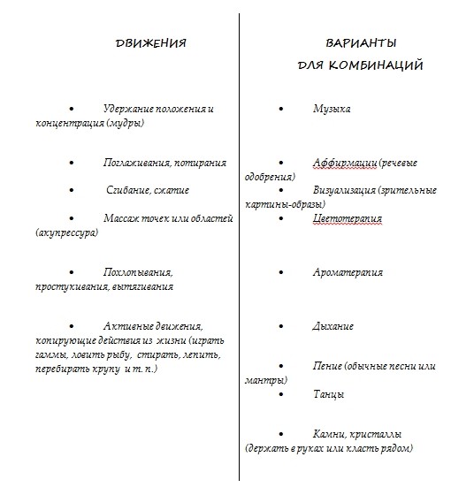 Движения, связанные с кистями рук и пальцами, можно условно разделить на несколько групп. Рассмотрите таблицу, приведённую ниже, слева – группы движений, справа – то, с чем вы можете комбинировать «пальцевые» практики. Создайте, так сказать, свой «коктейль». Не забывайте описывать свои ощущения и наблюдения от практики. Прислушивайтесь к себе, узнавайте себя, раскрывайте новые таланты.