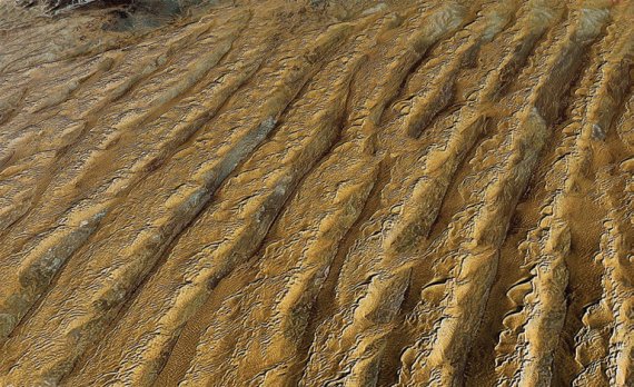 Рис. В. 13. Бесконечные гряды песчаных барханов негостеприимной пустыни Такла-Макан, котловина которой располагается юго-западнее Джунгарских ворот [Google, космическая съемка]. Средняя высота каждого из барханов близка к сотне метров, а некоторые гиганты возносятся даже до трех сотен. Каждый год ветер передвигает песчаные гряды со скоростью 150 м, угрожая существованию редких оазисов. Про эту пустыню молва гласит: «Войти-то в нее – войдешь, да не выйдешь!»