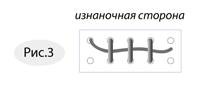 Вышивать удобнее от центра, двигаясь по направлению к краям. Сначала вышиваются основные стежки-кресты и полукресты, затем дополнительные – строчный стежок, французские узелки и др. Рабочая нить закрепляется с изнаночной стороны под несколько первых стежков (Рис.3). Заполнив фрагмент, закончите отрезок нити, также проведя её под уже имеющимися стежками. Узелки делать не нужно, так как вышивка будет выглядеть неровной.