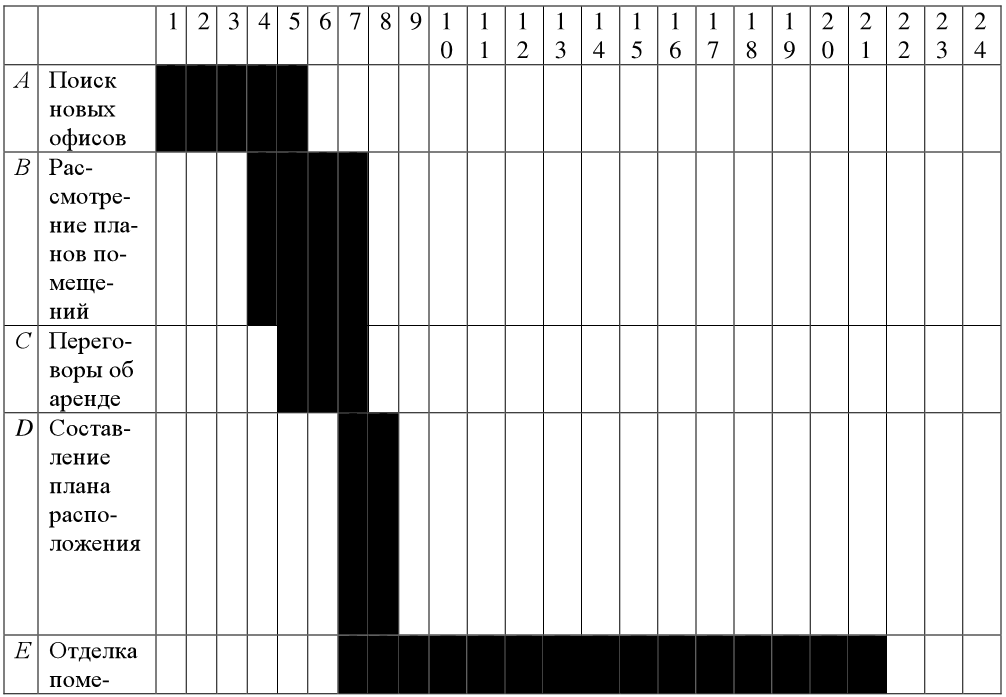 Для построения диаграммы необходимо отобразить стадии прямоугольниками, длины которых пропорциональны длительности стадий (Ошибка! Источник ссылки не найден.4). По вертикали отображаются стадии, по горизонтали дни выполнения. Отмечать прямоугольники обозначающие проведение мероприятия необходимо руководствуясь тем, что начинать каждую стадию так рано, как, только возможно. Продолжая процесс построения до исчерпания всех стадий, будет определена длительность проекта – 24 дня.