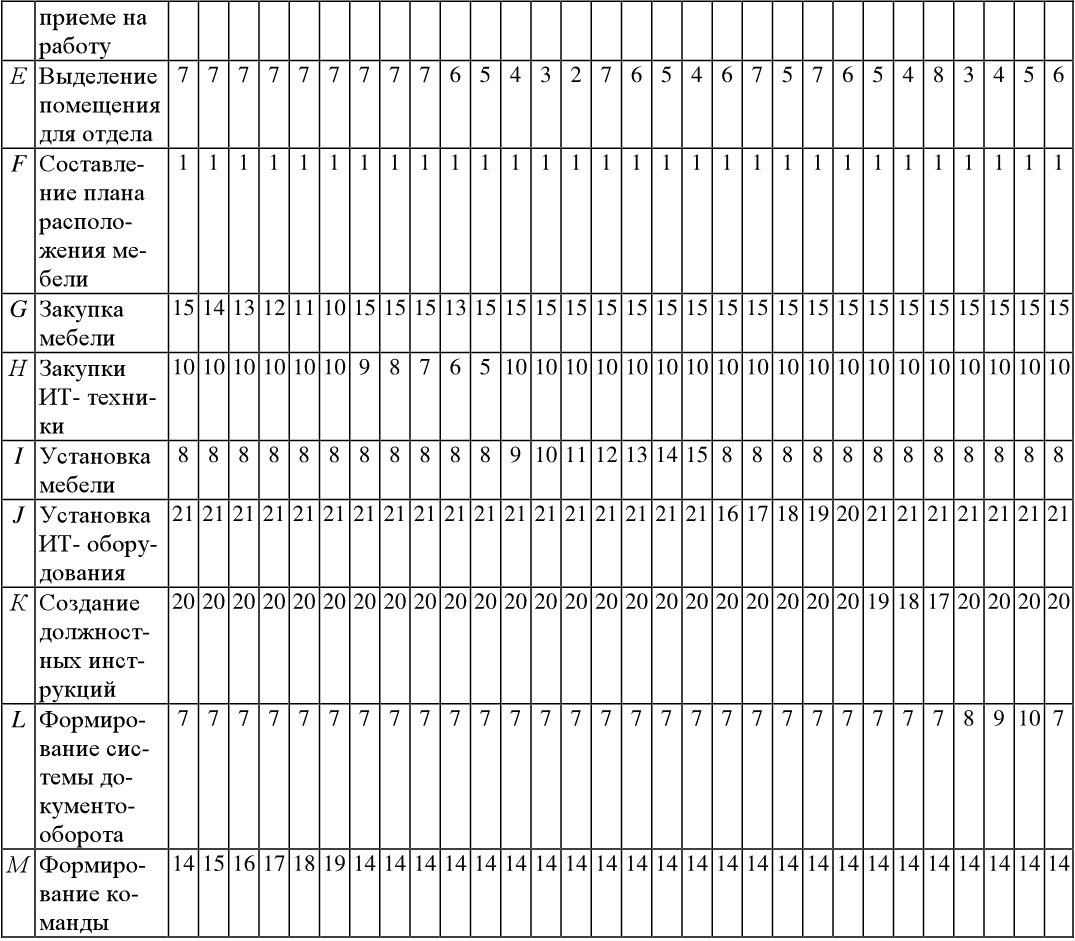Каждое из перечисленных мероприятий рассматриваться как независимая стадия проекта (или работа), требующая собственных материальных, финансовых и людских ресурсов. Для каждой стадии длительность проведения работ оценена, исходя из имеющихся ресурсов и приведена в таблице 1.