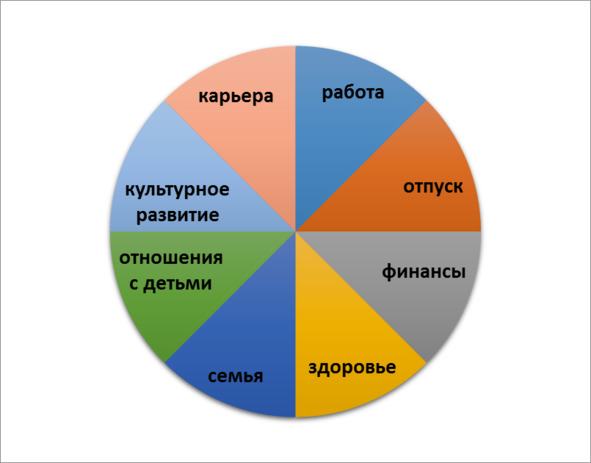 Баланс жизни. Нарисуем круг с пересекающимися в центре радиусами, пусть радиусов будет восемь – это число сфер жизни, их, конечно, по вашему усмотрению может быть больше (рисунок 1).