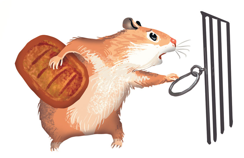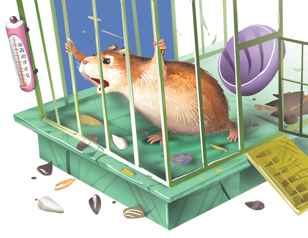 Хомячок тряс свою клетку так, что из неё сыпался мусор. Вообще-то у него давно был прогрызен тайный ход, по которому он лазил воровать печенье, но он не спешил на встречу с новичком.