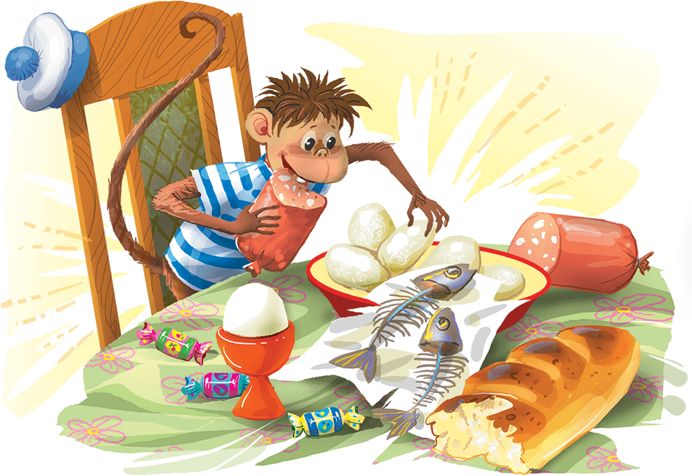 Обезьянка как начнет есть! Сначала колбасу, потом хлеб, потом варёную картошку, потом сырую, потом селёдочные очистки в бумажке, потом варёное яйцо в скорлупе прямо со скорлупой.
