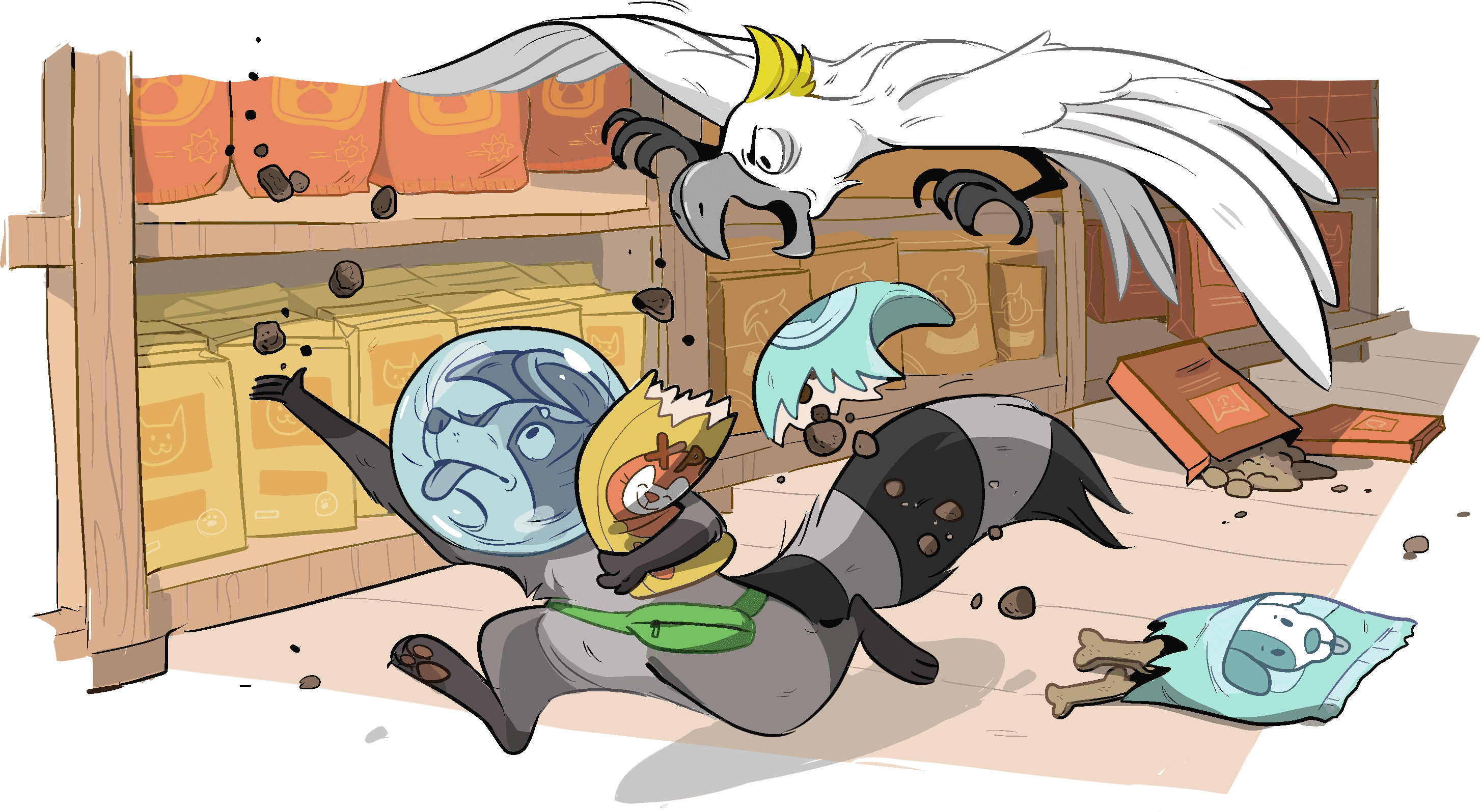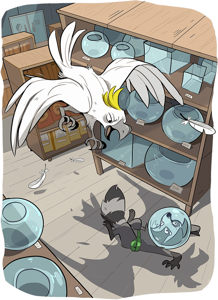 Попугай гнался за ним, сметая крыльями игрушки и пакеты с кормом. Енот петлял между стеллажами, чтобы запутать птицу. Сверху на него градом сыпался сухой корм – наверное, попугай разорвал пакет клювом. Енот попытался ловить корм ртом, но без толку – у него же на голове был аквариум!