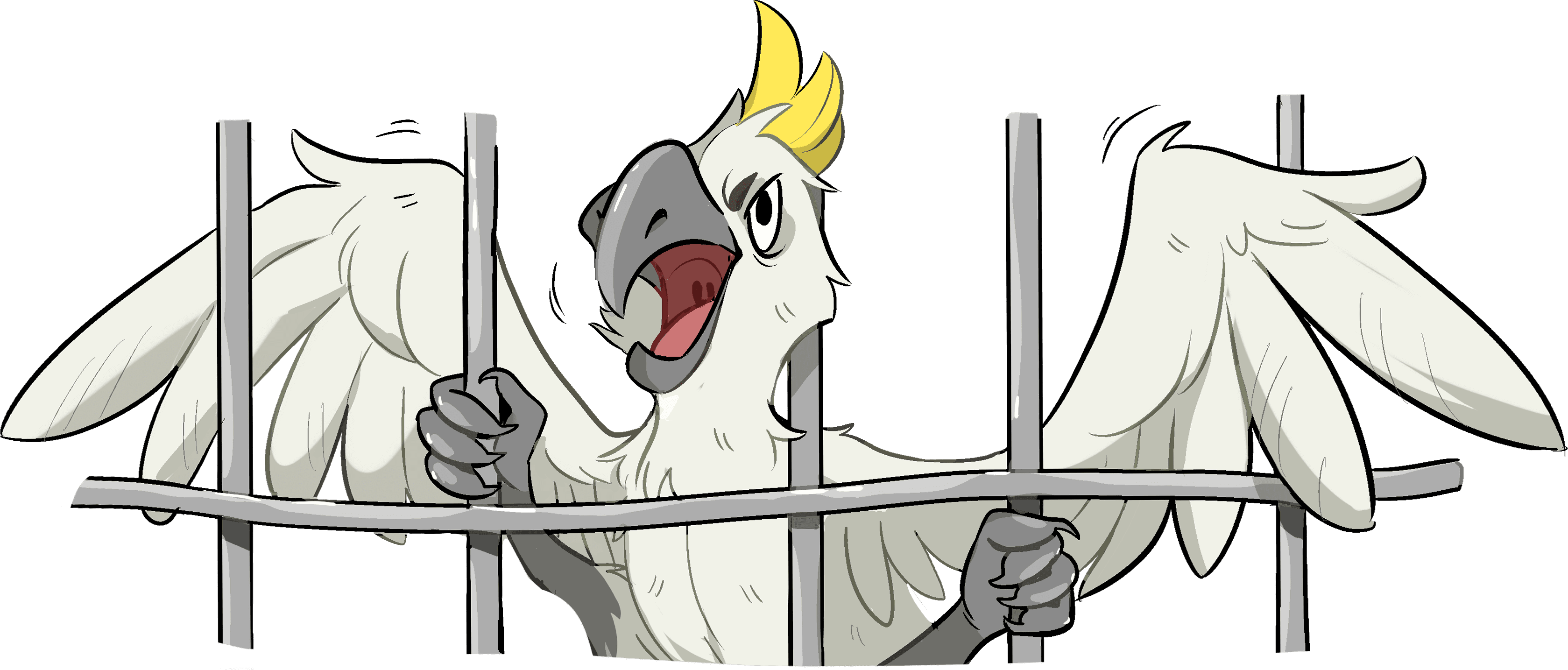 Попугай снова спикировал на Енота и клюнул в аквариум. Енот схватил с пола пригоршню корма и запульнул в попугая. Тот увернулся, но угодил прямо в клетку. Дверца захлопнулась, и попугай заметался внутри, истошно выкрикивая своё «А! А! А!».