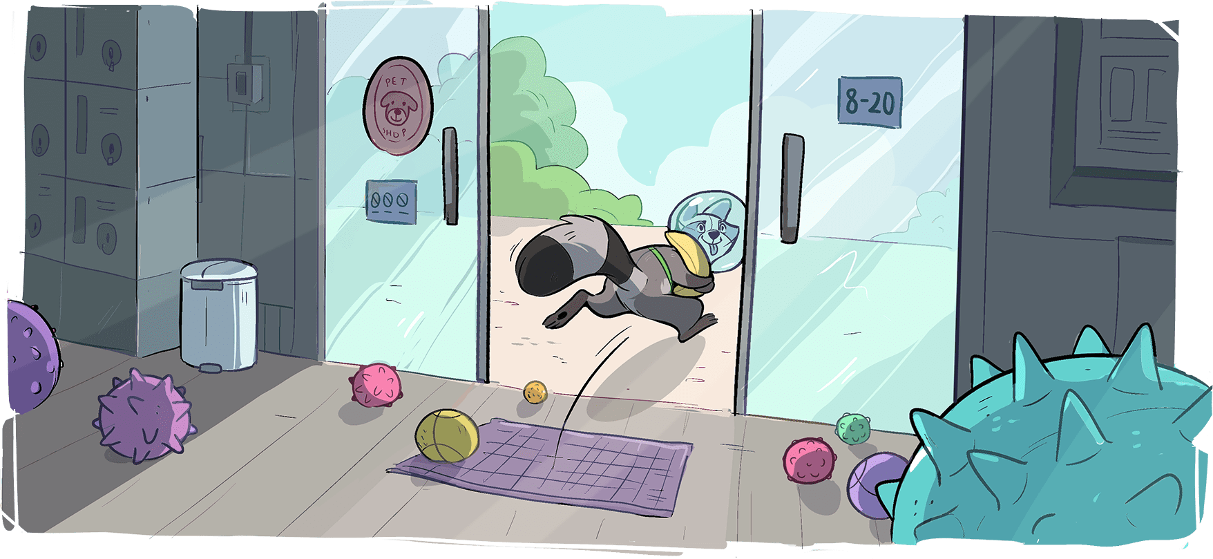 Но вместо птицы увидел, что круглый аквариум пошатнулся и летит с верхней полки прямо ему на голову. БАМ! В следующую секунду Енот стал похож на космонавта в скафандре.
