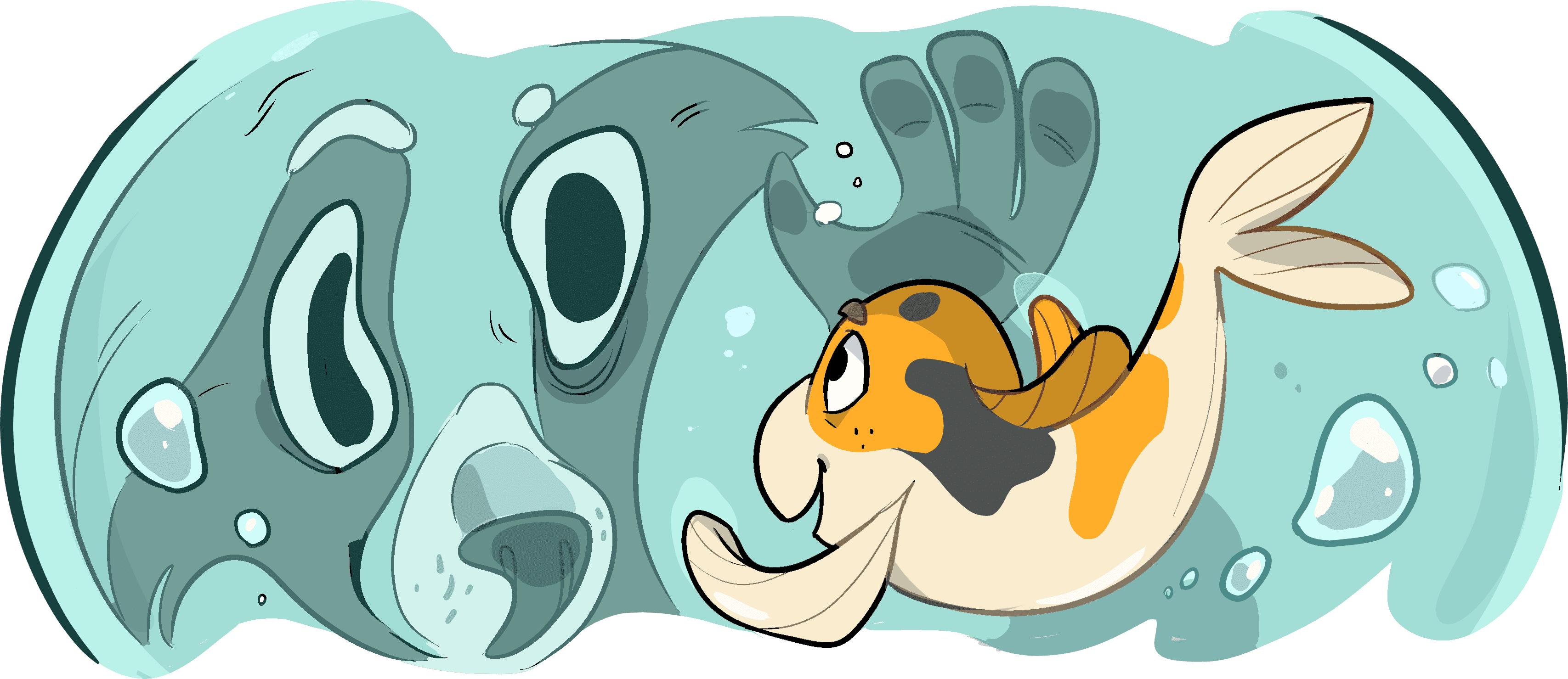 Енот опустил аквариум в воду, и Эдвард не без опаски заплыл внутрь. Енот вытащил наполненный до краёв аквариум и посмотрел на Эдварда.