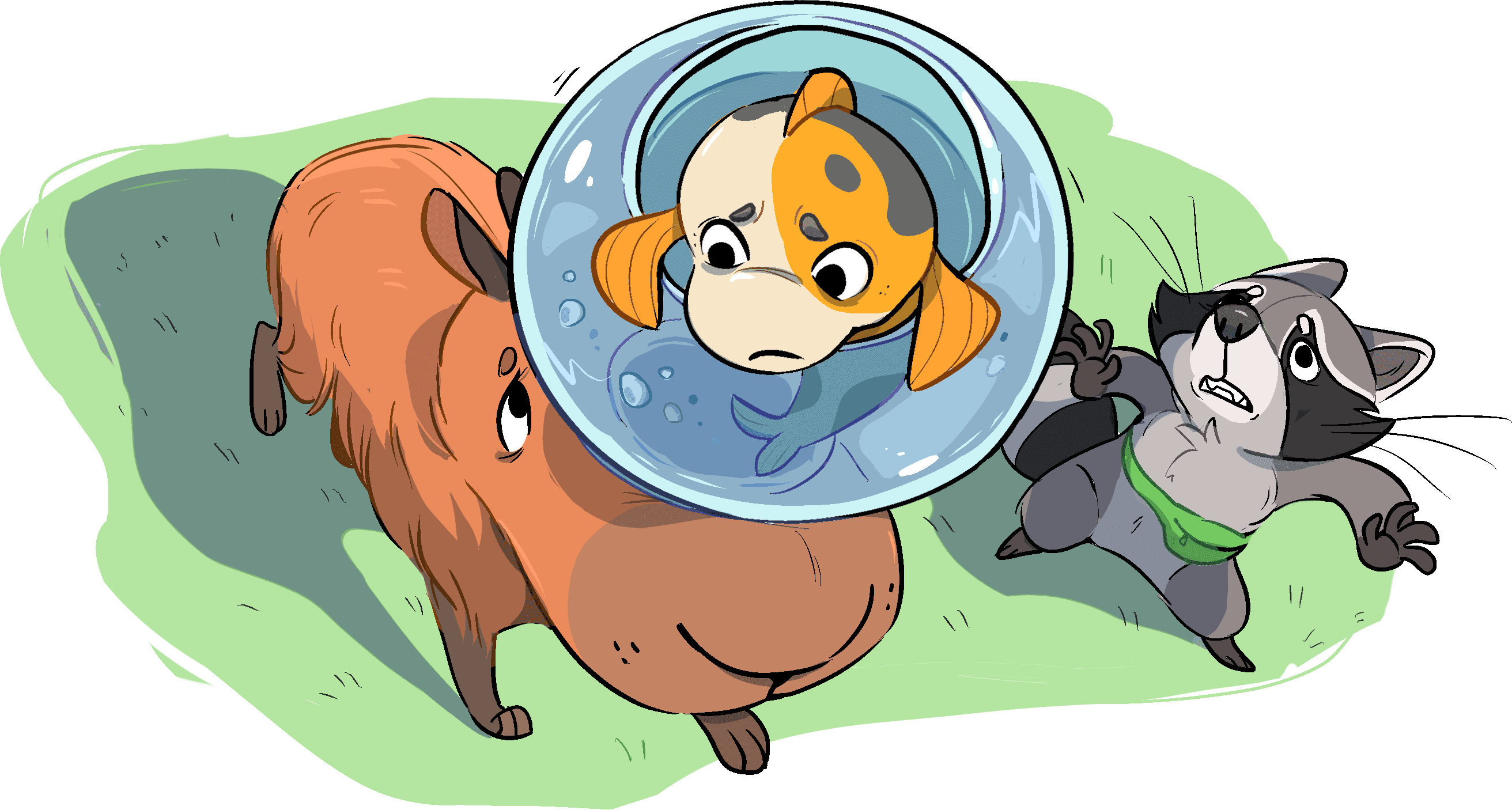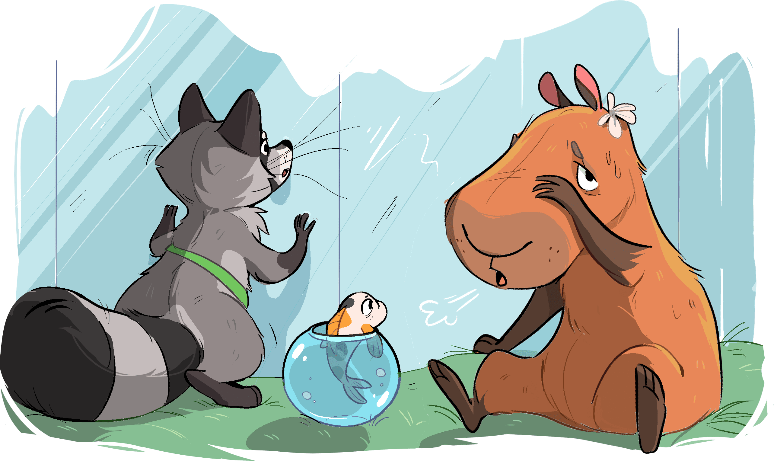 – Приятно познакомиться, HRV! Давай мы будем звать тебя Харви! – сказала Оливия. – Я капибара Оливия, это рыбка Эдвард, а это… Енот, просто Енот.