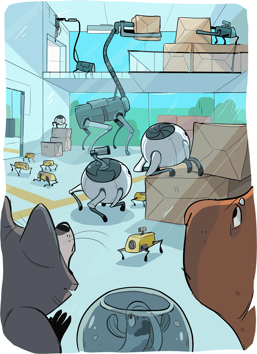 Тем временем за окнами ангара творилось нечто странное: в просторном тренировочном зале два белых создания, похожие на движущиеся скафандры, запрыгивали на ящики и столы, приседали и спрыгивали обратно. Тут же огромное металлическое существо, напоминающее длинношеего динозавра, поднимало коробки с первого этажа на второй. Маленькие жёлтые штуки, этакие бегающие скамейки с ногами как у кузнечиков, танцевали под громкую музыку и делали сальто назад.